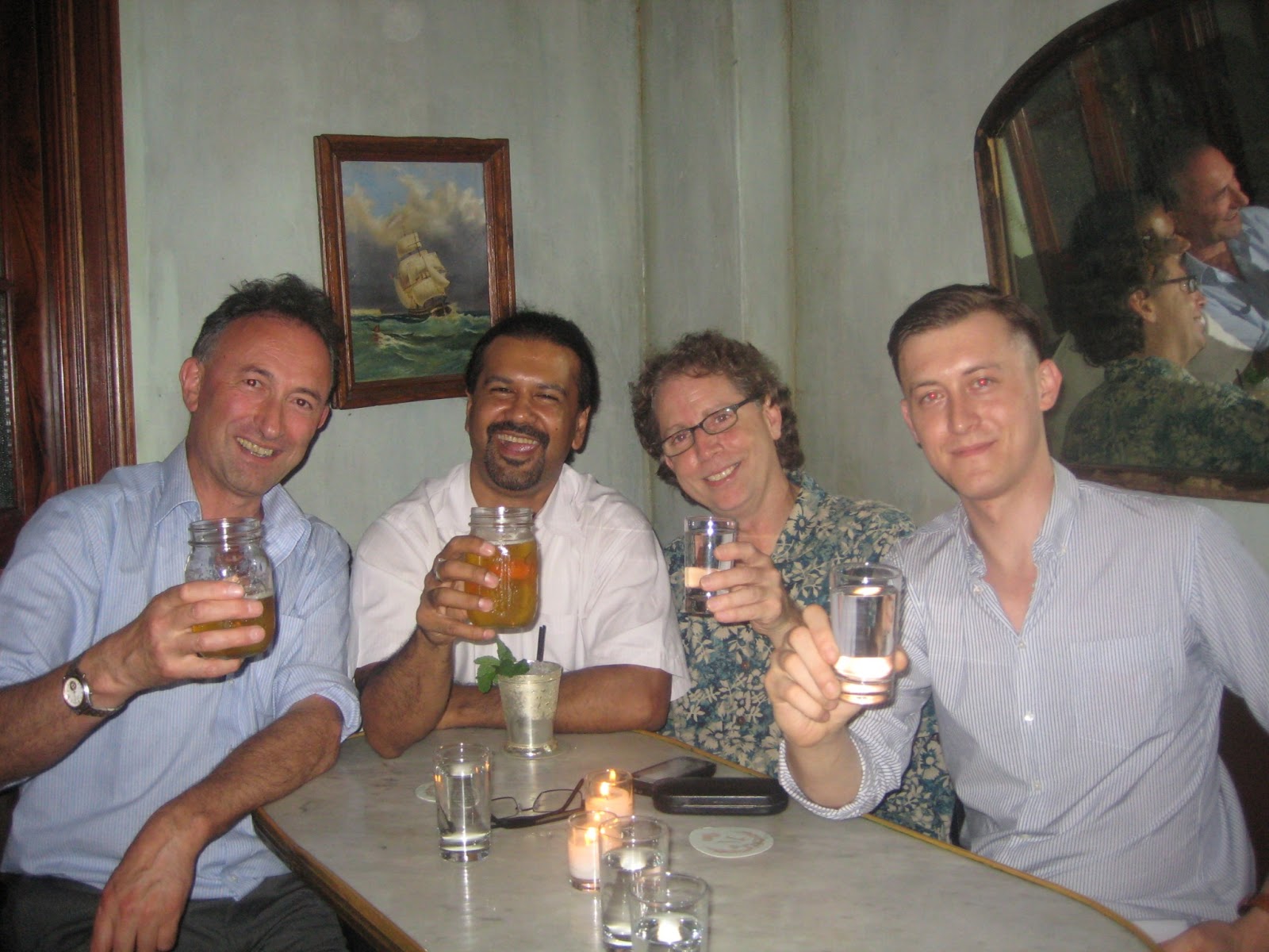 There is no hidden significance in my use of the above photo in an article called "Absinthe Antiques!" From left to right, it shows me, Kamal Mukherjee of DrinkUp NY, Scott MacDonald (more about him in a second), and Maxwell Britten of Maison Premiere. We're at Maison Premiere here. It's a rare photo showing four absinthe "movers and shakers," none of whom seem to be drinking absinthe. To be fair to us (and our livers), some of us had started drinking absinthe a little earlier (Maison Premiere's Happy Hour offer of $1 oysters is a must) and some of us would be seen drinking absinthe cocktails a few hours later in Battery Park!