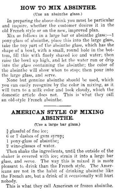 Without a time machine, it can be difficult to know how drinks were perceived and served over 130 years ago, but these pages (and the rest of the book) come close to providing that insight on absinthe in the USA at that time. Absinthe was clearly seen as a "normal" drink, with no hint of green fairies! The so-called old French style does not include sugar, while the other styles have several different ways of sweetening the absinthe. "American or frozen absinthe" resembles today's Absinthe Frappé as drunk in the USA, (although it is different from Craddock's Absinthe Frappé). And, surprise, surprise (!), there is no mention of fire.