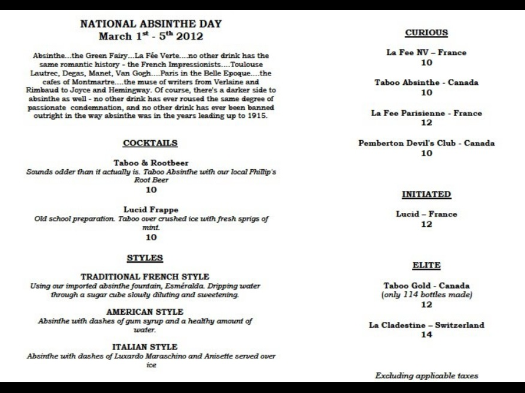 "This begins tonight! We are doing 5 days to celebrate National/International Absinthe Day/s. March 1st is for Europe and March 5th for the US, so we decided to bridge it."