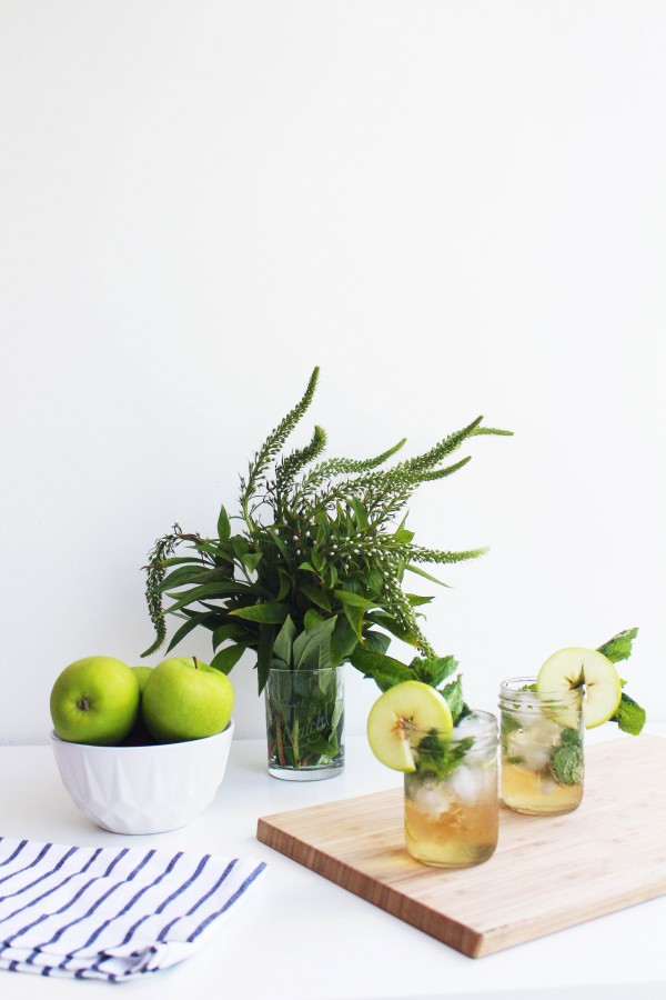 In a cocktail shaker add mint, apple juice, bourbon and coconut extract. Shake with ice, strain into glass, top with club soda, garnish with mint and apple.