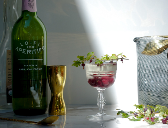 I put the gooseberries in the freezer, and tested a few martini options with the frozen gooseberries at the bottom of the glass. My hands down favorite combination for this cocktail is half vodka and half Lo-Fi Dry Vermouth made from a white wine base and infused with fennel, coriander, cardamom, elderflower, cherry, anise, and chamomile.