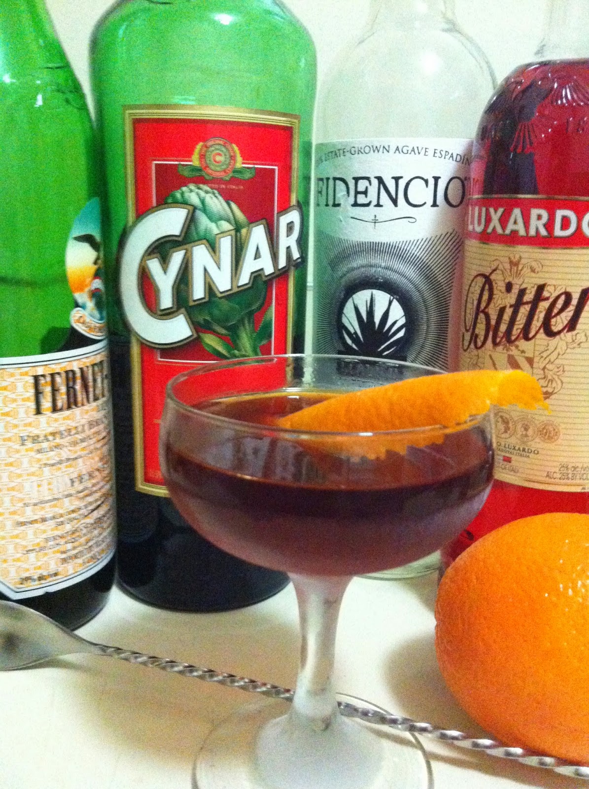 Notes on Ingredients: I did not have Campari, so substituted Luxardo Bitter. I also used Fidencio mezcal. The original calls for del Maguey's vida.