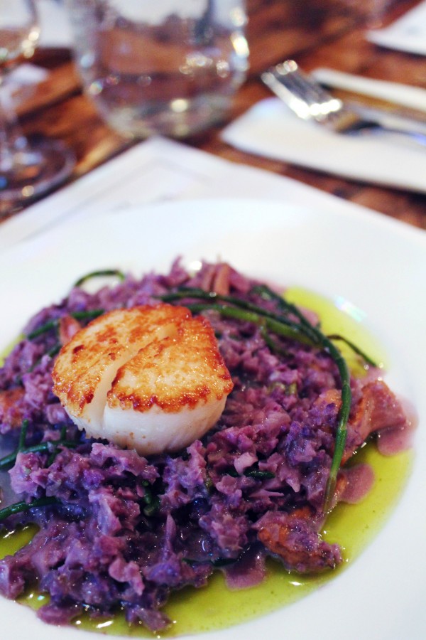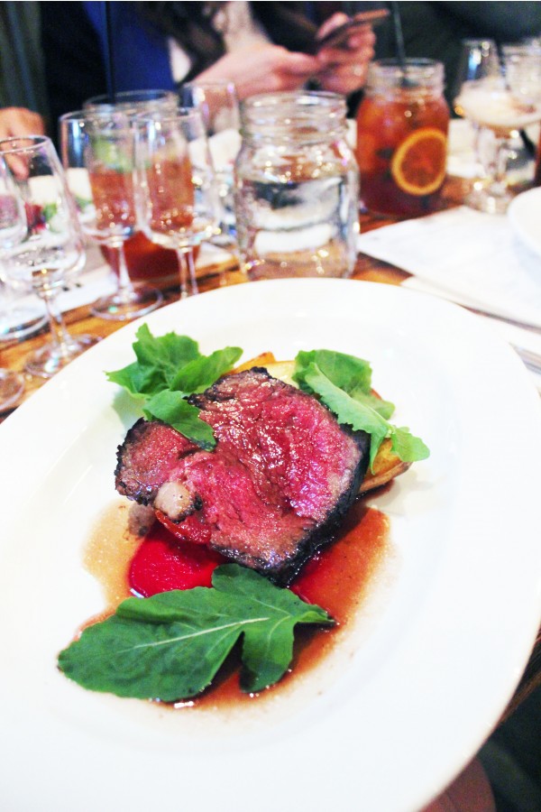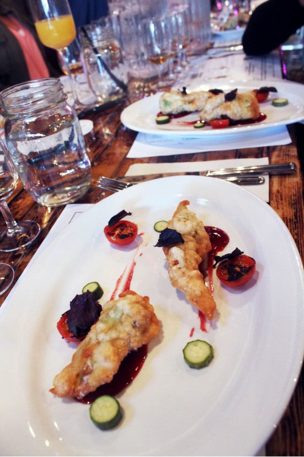 We were welcomed with a number of passed canapes and a wonderful welcome cocktail. The “Smoked Peach Belini” created by bartender and Dixies’ co-owner Shoel Davidson was made with Knob Creek 9 Year Old, peach puree, chocolate bitters, Prosecco and alderwood smoke. I enjoyed the cocktail but definitely enjoyed watching Shoel smoking the cocktail even more. The handheld smoke machines infuse an incredible amount of flavour (and showmanship) into a cocktail.