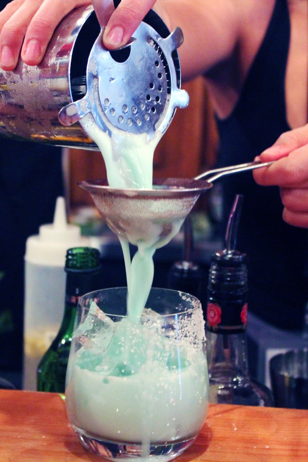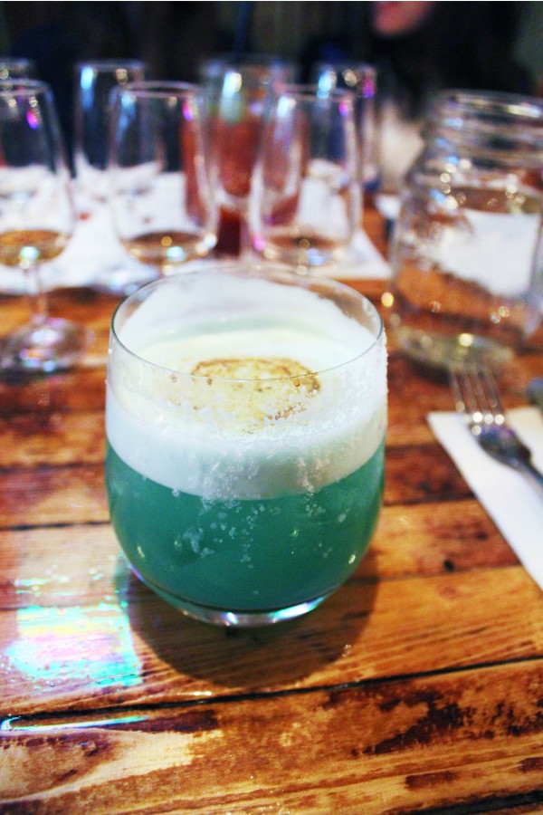 Entitled “Matty Jones’ Locker”, I wanted to create a deep-sea looking drink that paired well with a salt rim. As a take on a spicy margarita I used Knob Creek 9 Year, lime juice, blue curacao, ginger simple syrup, Hellfire bitters and egg whites.