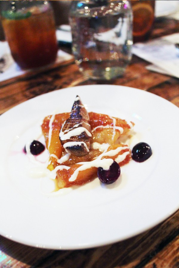 As we each had an opportunity to get behind the wood and make our cocktails with Matt, we were simultaneously spoiled by a four course dinner. The first course started with ricotta stuffed tempura coated squash blossoms, strawberry habanero jam, tomato and basil. This was followed by purple cauliflower “risotto”, seared scallop, chanterelles, sea asparagus and sorrel. The highlight of the meal was the grilled kobe beef, mixed beets, purple fingerlings, arugula and smoked bone marrow jus followed by an incredibly paired peach tart tatin, seared foie gras, pickled concorde grapes and orange creme fraiche.