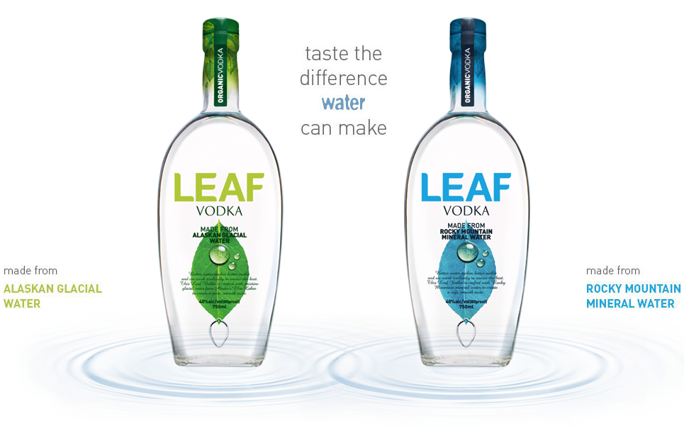 LEAF Vodka’s two expressions: green for Alaskan Glacial Water Vodka and Blue for Rocky Mountain Mineral Water Vodka.