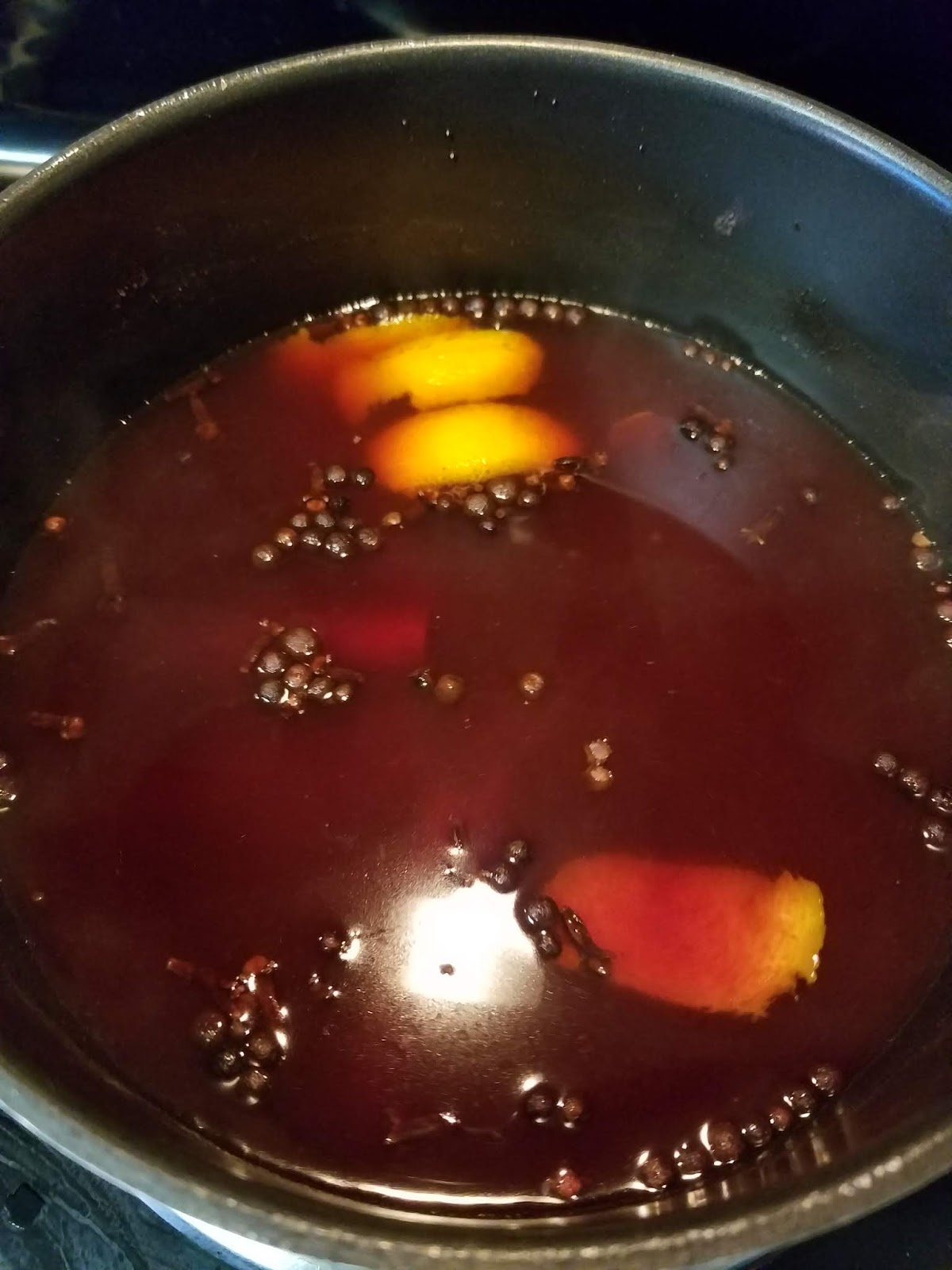 The first step is to make the mulled cider. The following recipe yields approximately 2 quarts of cider, so feel free to adjust the ingredient amounts as needed for your gathering. In a large saucepan or pot (minimum 3 to 4 quart size) place: