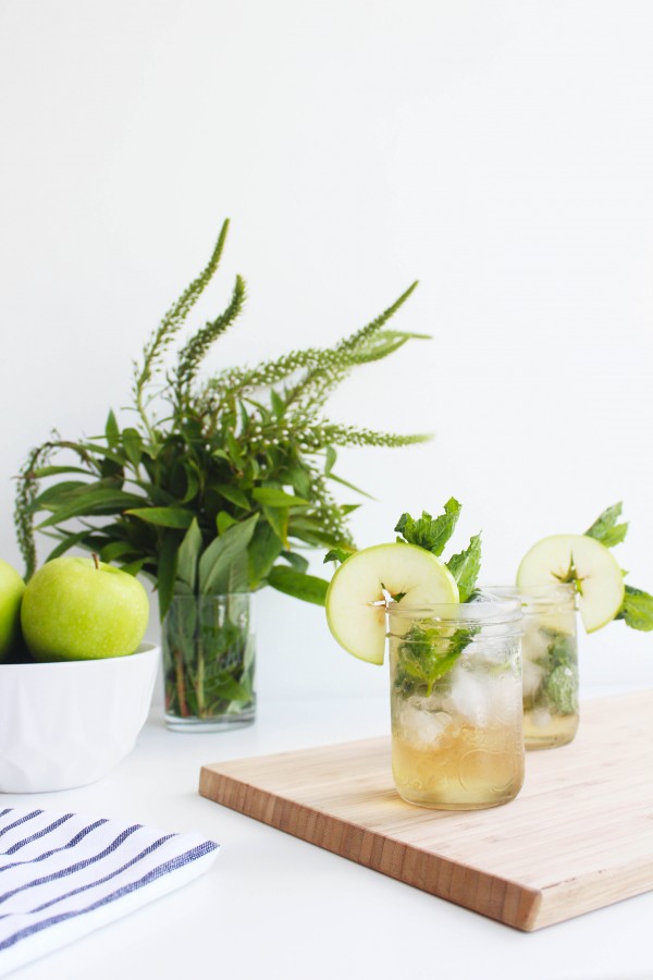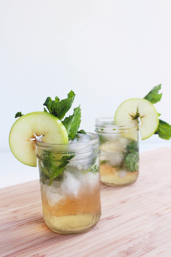 In a cocktail shaker add mint, apple juice, bourbon and coconut extract. Shake with ice, strain into glass, top with club soda, garnish with mint and apple.